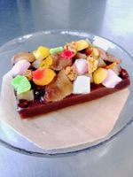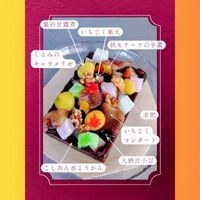 地場産(千葉県館山市)いちじくを使用した「いちじく寒天」といちじくの赤ワインコンポート、キャラメリゼしたくるみ、大納言小豆、ピンクとグリーンと白の三色求肥、栗の甘露煮を散りばめた贅沢な和スイーツ